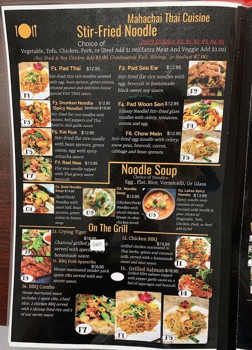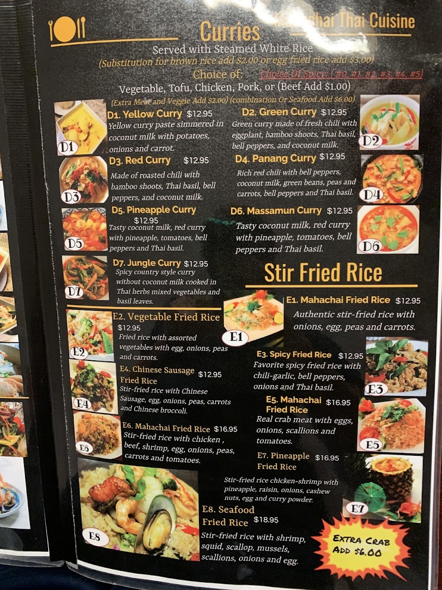 When it comes to curries, Mahachai doesn't hold back. The Yellow Curry ($9.95) is rich and comforting, simmered in creamy coconut milk and combined with tender potatoes and your choice of protein. If you're a fan of a bit more heat, the Panang Curry ($9.95) features a deep red chili flavor enhanced with colorful veggies and fragrant Thai basil, offering a beautifully balanced dish that's hearty yet refined.